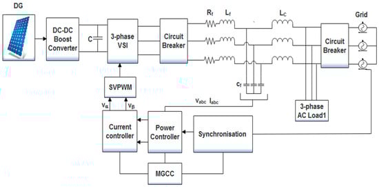 The power circuit contains two solar photovoltaic (PV) modules, a three-phase voltage source inverter (VSI), RLC filter, coupling inductor and two RL loads. Since the studied MG is operated in an islanded mode, the utility grid disconnected from the rest of the network using a three-phase circuit breaker. In order to control the voltage and frequency of the studied MG system, the voltage and current signals are converted from abc to dq reference frame by using well-known Park’s transformation as given in Equations (1) and (2), respectively: