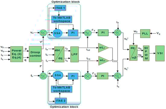 In this section, a detailed insight of the islanded MG model along with the proposed SSA based voltage-frequency (v-f) controller is provided. A comprehensive block diagram of the power and control circuit of the studied islanded infinite bus MG system is shown in Figure 3.