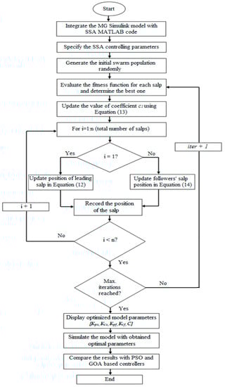 Further details of SSA along with its pseudo-code and benchmarking against the conventional optimization methods can be found in reference [3]. It may be noted that for tuning the characteristics of the SSA for solving a specific problem, two parameters may be adjusted, namely the number of searching salps and the total iterations’ number. The complete methodology of obtaining optimal PI parameters and dc-link capacitance for enhancing the dynamic response of the grid-tied MG system using SSA is depicted in the flow-chart shown in Figure 5.