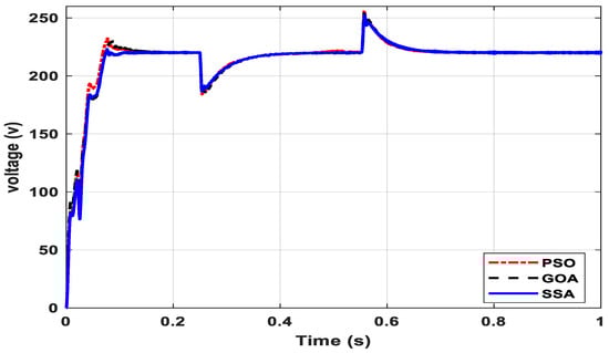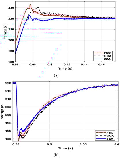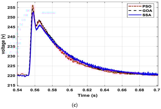 It may be noted from Figure 6 that the system voltage observed an overshoot during the DG insertion at 0.05 s of simulation. The magnitude of the overshoot depended on the DG rating as well as the selection of controller parameters. In order to have a fair comparison between the three optimal parameter selection methods, i.e., PSO, GOA and SSA, the DG rating and other system parameters were taken identical for all three cases. At 0.25 s of the simulation, a load of 40 kW, 20 kVAR was added to the system, and as a result of that, the system voltage observed a dip in voltage. Similarly, at 0.55 s, the load-3 was disconnected from the system. The corresponding response shows a swell in voltage at the mentioned simulation time. A zoomed version of Figure 6 during DG injection, load injection and load detachment is shown in Figure 7a–c, respectively.
