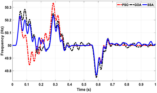 It is obvious from Figure 7a–c that the optimal parameters obtained by the SSA optimization method provide better results compared to PSO and GOA in terms of overshoot and settling time for all three studied conditions. Another parameter that needs to be regulated during the islanded mode of MG operation is the frequency of the system. The frequency response of the system for PSO, GOA and SSA based MG system is shown in Figure 8.