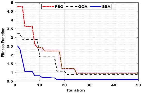 In this section, the results obtained from the performance evaluation of the studied optimization algorithms are presented. Three different optimization algorithms, namely PSO, GOA and SSA, were tested to minimize the stated fitness function under identical operating conditions and system parameters. Furthermore, in order to carry out a fair comparison among the mentioned algorithms, all algorithms were tested for an identical number of iterations, i.e., 50 iterations, and number of search agents, i.e., 50 number of search agents. Since all the metaheuristic algorithms were initiated by spreading the search agents randomly in the bounded search area, the current study was tested for 20 simulation runs for each algorithm and the best (minimum) fitness function values were adopted for comparison. The convergence curve for the tested algorithms is shown in Figure 9.