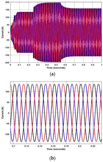 Three-phase sinusoidal current waveform (a) complete operation (b) zoomed version from 0.1–0.22 s.