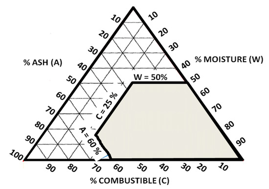 Tanner diagram (from [16]) where, A: ash; C: combustible material; W: moisture content.