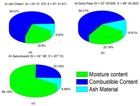 Ash must be less than 60%, the moisture content should also be below 50%, and the combustible material should be greater than 25% for the fuel to burn independently. A detailed description of ash, moisture, and combustible contents of the case study area are depicted in Figure 5.