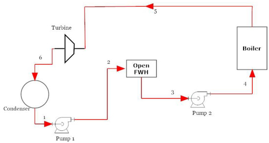 Using water and steam thermodynamic tables, enthalpy, entropy, and specific volume of each state is calculated. Mass and energy balance is applied to each component to determine the , , , and . All the depicted equations are described in detail in reference [21].