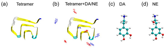 (a,b) Initial states of αS tetramer and tetramer in the absence and presence of DA/NE (dopamine/norepinephrine) molecules. DA and NE molecules are colored in red and blue, respectively. The Cα-atom of the N-terminal residue T44 in each αS peptide is represented by a blue bead. (c,d) Chemical structures of DA and NE molecules. Color codes: carbon atoms (cyan), oxygen atoms (red), nitrogen atoms (blue), and hydrogen atoms (white).