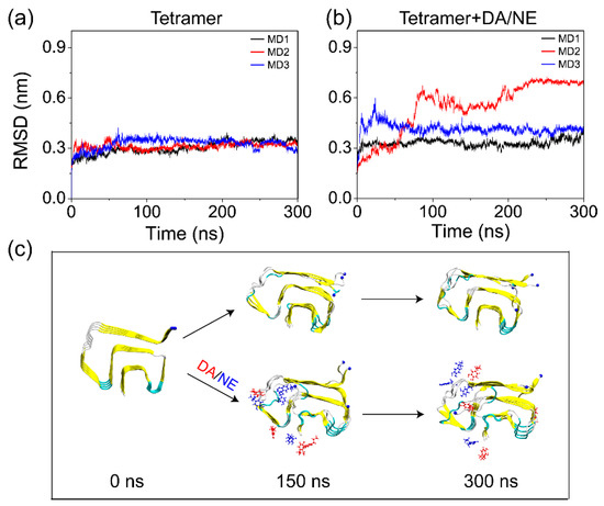 Structural stability analysis of αS tetramer in the absence and presence of DA/NE molecules. (a,b) The Cα-RMSD of αS tetramer in the tetramer and tetramer + DA/NE systems as a function of simulation time. (c) Snapshots of the tetramer and tetramer + DA/NE systems at 0, 150, and 300 ns. The representations are consistent with those in Figure 1.