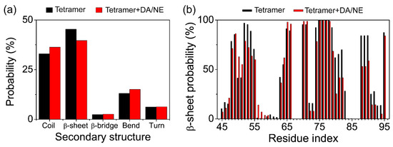 To examine the influence of DA/NE molecules on the secondary structure of αS tetramer, we then calculated the probabilities of different secondary structures (coil, β-sheet, β-bridge, bend, and turn) of αS tetramer using the last 50 ns trajectory data. As shown in Figure 3a, with the addition of DA/NE molecules, the average value of β-sheet probability decreased from 45.3% to 35.7%; the average value of coil/bend probabilities increased from 32.9/13.1% to 36.3/15.1%; the probabilities of β-bridge and turn did not change much. These demonstrate that DA/NE molecules can reduce the β-sheet content of αS tetramer and convert part of the β-sheet structure into the random coil or bend conformation. To identify the residues that contribute the most to the β-sheet reduction, we further calculated the β-sheet probability for the individual residue of αS44–-96 peptides in Figure 3b. It is shown that the β-sheet probabilities of residues V52-V55, T72-V74, Q79-E83, and I88-V95 in the tetramer + DA/NE system were strongly reduced compared to those in the isolated αS tetramer system. The previous NMR study suggested that the fragments T44-V55, E61-G66, V70-A78, T81-E83, and I88-K96 adopt the β-sheet in αS44–-96 protofibril [39], and the innermost β-sheet of the core including residues 71–82 was reported to be necessary for αS fibril formation [73,74]. These regions are involved in the reduction of β-sheets observed in our simulations, which is supposed to go against αS fibrillation. Overall, DA/NE molecules can serve as a β-sheet breaker to disrupt the β-sheet structures of αS44–-96 protofibrils.