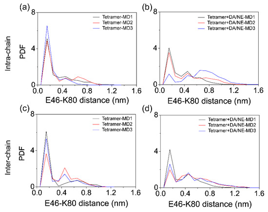 As previous experimental and computational studies suggested that E46-K80 salt-bridges are crucial for the stability of αS protofibril [39,75], we examined the influence of DA/NE molecules on the E46-K80 salt-bridges. The probability density function (PDF) of intra- and inter-peptide E46-K80 distance between the side-chain COO− group of E46 and the Nζ atom of the side-chain NH3+ group of K80 was calculated using the last 50 ns of data of all the MD runs. Figure 4a,b shows the intra-peptide E46-K80 distance distribution. There existed a sharp peak centered at 0.15 nm in the isolated tetramer system, indicating well preserved salt bridges, while the peak value became much smaller in the tetramer + DA/NE system. Figure 4c,d shows the inter-peptide E46-K80 distance distribution. Two peaks centered at 0.15 and 0.45 nm were observed in the isolated tetramer system, while there was a significant reduction of the two peak values in the tetramer + DA/NE system, especially for that at 0.15 nm. These results demonstrate that DA/NE molecules can destroy the intra- and inter-peptide E46-K80 salt bridges, as a result destabilizing αS tetramer protofibril.
