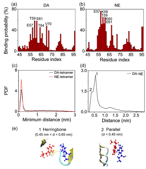 To identify the binding sites of each neurotransmitter (DA or NE) on αS tetramer, we respectively calculated the residue based binding probability of DA and NE molecules to αS tetramer using the last 50 ns of data of the simulations. As shown in Figure 6, DA molecules had the highest binding probability with polar residues T59 and T64, negatively charged residues E61 and E57, and hydrophobic residue V70; NE molecules had the highest binding probability with polar residue T59, negatively charged E57 and E61, and positively charged K58 and K60. Both DA and NE molecules preferentially bind to the charged residues E57 and E61 and polar residue T59, indicating the important role of electrostatic interaction in the DA/NE–tetramer interaction. The aforementioned calculation of H-bond number shows that the charged residues E57, K58, and K60, as well as the polar residue T59 have a high affinity of forming H-bonds with DA/NE molecules. This reflects that H-bonding interaction also plays a role in the binding of DA/NE molecules to αS tetramer. Small molecules carrying net or partial charges may have a high binding probability with negatively and positively charged residues at the same time [67,77,78]. Besides, we found that DA molecules have a high binding probability with hydrophobic residue V70. As DA has the polar part (two hydroxyl groups) and nonpolar part (benzene ring), the benzene rings of DA molecules binding to residue V70 were found to be close to the hydrophobic side-chain of V70 through the MD trajectory track, indicating a strong hydrophobic interaction in between. However, NE molecules do not bind to V70 with a high probability, and this difference might be attributed to the lower hydrophilicity of the DA molecule compared to NE, because the DA molecule has one less hydroxyl group. Overall, these results indicate that the electrostatic and H-bonding interactions play dominant roles in the binding of DA/NE molecules to αS tetramer.