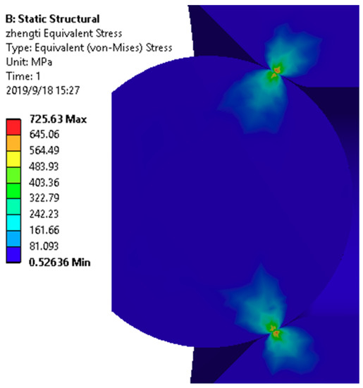 pmax = 1220 MPa. The error between the two is about 9.2%, less than 10%, which verifies the correctness of the theoretical model. The overall equivalent stress distribution is obtained as shown in