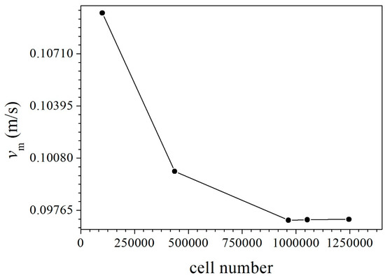 The parameter settings of the meshing referred to Eppinger’s research [18]. The relative size of the surface and volume mesh can be determined on the base size. In this part, the cell numbers were obtained by adjusting the base size (0.5~10d) for the surface and volume mesh generation. The relationship between cell number and average velocity magnitude is shown in Figure 2.