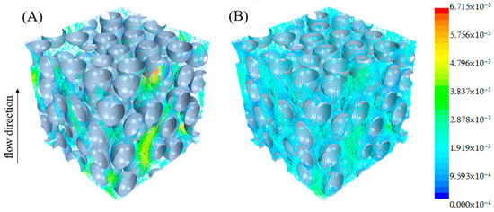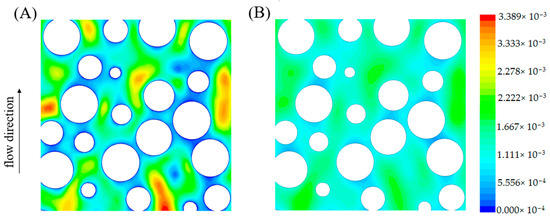 Figure 3 shows the velocity field of the fluid for the rigid and anaerobic granule swarms. The fluid flows through anaerobic granule swarms and forms a complex network. Figure 4 is a cross sectional view of Figure 3 at . It can be seen that in both the rigid sphere granule swarm and the anaerobic granule swarm, there will be a low-speed region around the granules, and a high-speed region at the center of the pores. However, for anaerobic granules, as the effect of their permeability, a part of the fluid passes through the granule interior, which makes the velocity around the granules significantly higher than that of the rigid sphere granules. Moreover, the velocity at the center of the pore is significantly lower than that of rigid spheres. This makes the external flow field of the anaerobic granules more uniform than that of the rigid sphere granules.