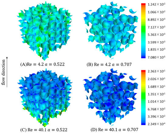 The distribution of surface shear stress on anaerobic granule swarms. (A) Re = 4.2 , (B) Re = 4.2 , (C) Re = 40.1 , (D) Re = 40.1 .