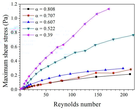 Figure 8 shows the variation of maximum shear stress under different voidages and Reynolds numbers. It can be seen that with the decrease of and the increase of Re, the maximum value of shear stress increases. It can be concluded that the smaller and the higher superficial velocity the voidage of the anaerobic granule swarm make the granules easier to be broken. In general, the granules with a loose structure are broken by a larger shear force on the surface. Therefore, a smaller voidage and a higher superficial velocity would benefit the granulation of the microbial bacteria and increasing density of granules in the reactor.