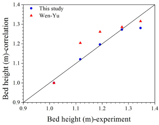 Comparisons between the experimental values of bed expansion height and the calculated values by the improved model in the present study and Wen-Yu model.