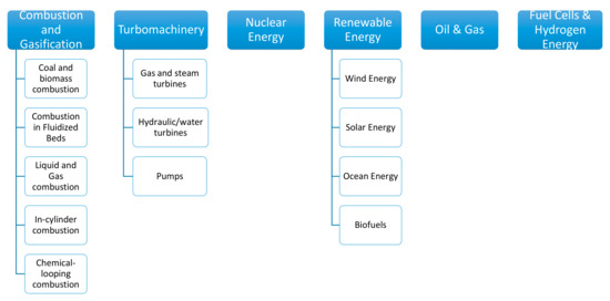 This section will cover the main CFD applications in energy and thermal engineering. A thorough review of such a wide variety of different applications is however not feasible within one single publication. Instead, a brief introduction to the most significant reviews that have been published on the particular topics related to CFD in energy and thermal engineering is provided. The objective of the review is thus to provide an overview of the CFD applications in energy and thermal engineering, highlighting the review papers published on the different topics, so that readers can refer to the different review papers for a thorough revision of the state of the art and contributions into the particular field of interest. The applications covered are depicted in Figure 1.