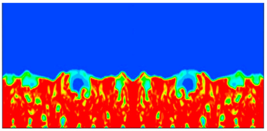 Time snapshot of a CFD simulation of fluidized bed (gas volume fraction in blue, sand particles volume fraction in red).