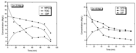 Figure 5 shows the degradation profiles of NPEG, the mineralization of organic compounds, as well as the estimation of OIP (Equation (4)).