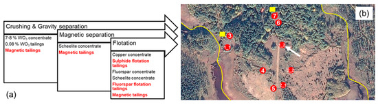 (a) Processes from which the Yxsjöberg historical tailings were generated. (b) Drill core sampling locations on the Smaltjärnen tailings storage facilities (TSF) represented by red dots; the yellow squares show two discharge points, the yellow lines show the repository boundary, and the white arrow shows the focus area for this study.