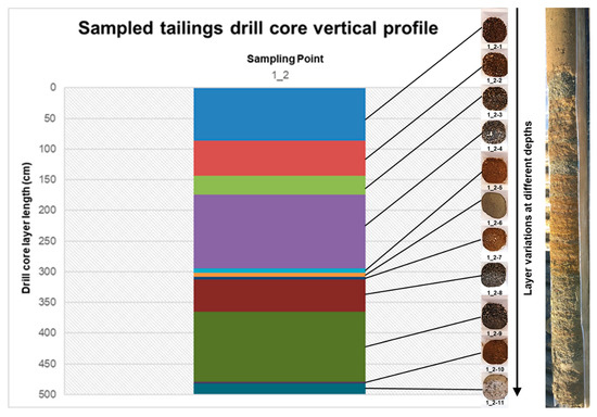 The actual sampling points in the selected locations were randomly picked, and a summary of the information about one sampling point used in this paper is given in Table 1. Screening of the drill core was done based on the differences in color and granulometry in the core, and the drill core was divided into sub-samples representing tailing layers in this particular location of the repository. The thickness of each observed compacted layer was noted to have its approximate thickness in the tailing repository. The vertical profile showing the different layers in the tailings in the selected location of the repository is shown in Figure 2. Each color represents a separate layer of the of the tailings and its compacted thickness. Eleven layers were observed at sampling point 1_2, where the total compacted tailing thickness in the 600 cm drill hole was approximately 500 cm. Since each plexiglass tube was only 1.2 m long, five pieces of drill cores were recovered from the drill hole.