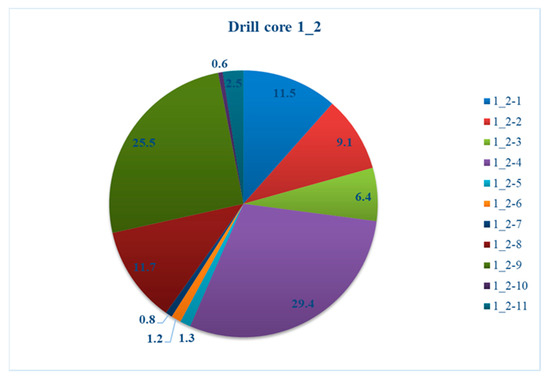 The mineralogical composition was characterized by X-ray Diffraction (XRD) using a PANalytical Empyrean X-ray diffractometer (PANalytical B.V., Almelo, The Netherlands). Drill core layers 1_2-1, 1_2-4, 1_2-8, and 1_2-9 were selected for this analysis as they had the highest mass distributions in this drill core, as shown in Figure 3. Small samples (i.e., less than 50 g) of these selected layers were pulverized in a ring mill to obtain the powder samples required for XRD analysis. The raw data obtained from the diffractometer were evaluated using the PANalytical X’Pert HighScore Plus v3.0 software (3.0d (3.0.4), PANalytical B.V., Almelo, The Netherlands, 2011).