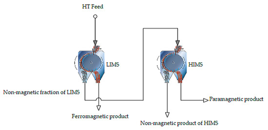 The simplified flowsheet of magnetic separation process: dry low-intensity magnetic separation (LIMS) and high-intensity magnetic separation (HIMS).