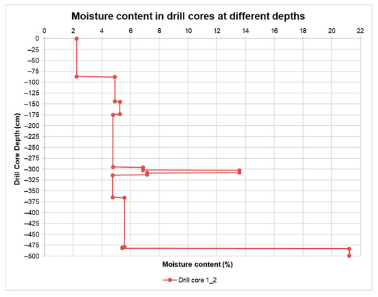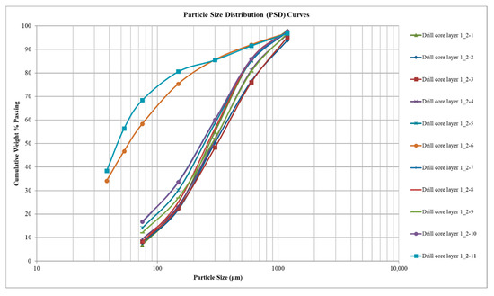 The physical and chemical characterization of the HT showed variations occurring in the different layers of the drill cores, which revealed the variability at different depths of this repository location. In terms of moisture content, some of the upper tailing layers had higher moisture content than lower layers (Figure 6). This moisture variation results from varying grain size distribution in the tailing layers. It was observed that layers with significantly higher fraction of finer particles (1_2-6 and 1_2-11) had higher moisture content than the layers with relatively coarser particles. In order to illustrate particle size variation with depths, the determined D80 values for the various layers of the drill core were plotted against the depth, as shown in Figure 7.