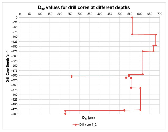 Variation of D80 values with depth. This graph type depicts the observed abrupt changes in the drill core layers.