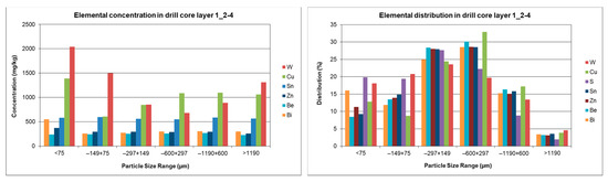 Figure 9 illustrates elemental concentrations and mass distributions for layer 1_2-4 as an example, which is the layer with the highest mass distribution of tailings in this drill core (compare Figure 3). Considering the drill core as a whole, W and Cu, as the main metals of interest, were observed to have high concentrations of 2329 mg/kg and 1427 mg/kg, respectively, in the fine (<75 µm) particle size fraction. All elements were high in the dominating particle size fractions mentioned earlier. Therefore, for purposes of reprocessing these HT, additional steps for ensuring sufficient mineral liberation need to be considered for such coarse tailings particles.