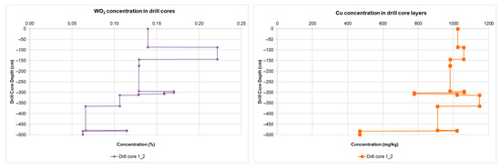 WO3 (left) and Cu (right) concentrations in the 11 drill core layers.