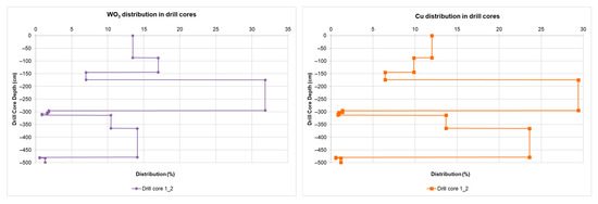 WO3 (left) and Cu (right) mass distributions in the 11 drill core layers.