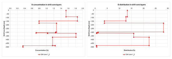 Since these tailings have been stored in this repository for a long period, sulphur depletion due to oxidation was expected, with the depletion decreasing from top to bottom—even though this would also depend on other factors such as particle size and initial quantity. Therefore, both the concentration and mass distribution of sulphur in each layer was analyzed. The highest S concentration was also in layer 1_2-2 at 1.85%, as shown in Figure 12 (left). However, with regard to mass distribution, it was observed that much of the S was contained in layer 1_2-4 at the depth between 174 and 295 cm, with 28 wt.% of the total S.