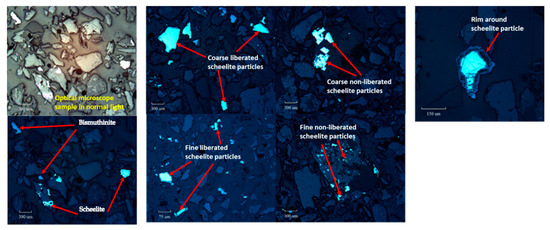 Under the optical microscope, scheelite particles were observed in normal light and with a blue filter (Figure 13). The scheelite particles in the polished samples were both fine and coarse, as well as liberated and non-liberated, meaning that mineral liberation analysis would be essential in order to develop effective separation methods. Some particles showed rims, which were identified as hydrous ferric oxides [20]; hence, the recovery of such scheelite mineral particles may be hindered in processes like flotation where reagents need to have contact with the mineral particle, and also in magnetic separation where scheelite would end up being pulled to the paramagnetic fraction. Hence, pre-treatment methods such as scrubbing may be required. The main minerals in which the main elements W, Cu, S, Sn, Zn, Be, Bi, and F were contained were scheelite, chalcopyrite, pyrrhotite, cassiterite, danalite (both Zn and Be), bismuthinite, and fluorspar, respectively [20,24]