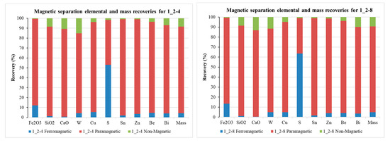 The desired outcome of the magnetic separation test was to have the valuable minerals (scheelite, fluorspar, and chalcopyrite) in the non-magnetic fraction of the HIMS, but the mass recovery to this fraction for both samples was very low, with the highest amount being only 9.2 wt.% from layer 1_2-8. From Figure 14 and Table 5, it is observed that much of the W and Cu ended up in the paramagnetic fraction for both layers; meaning the separation of scheelite and chalcopyrite was not achieved as desired. This could be due to the insufficient liberation of scheelite and chalcopyrite minerals from pyrrhotite and/or to liberated small particles being entrapped and entrained by the paramagnetic particles. The insufficient liberation of scheelite was confirmed by the higher W recovery of 83.6 wt.% in the paramagnetic fraction, from the less coarse layer 1_2-8 which had more W retained in the –600 to +297 µm fraction as compared to layer 1_2-4. The paramagnetic fraction had the highest mass recoveries with 87.3 wt.% for layer 1_2-4 and 85.8 wt.% for layer 1_2-8, and based on EMC, approximately 40 wt.% and 30 wt.% of pyrrhotite was in this fraction, respectively, indicating that a high amount of pyrrhotite was ferromagnetic. Sulphur was mostly recovered in the ferromagnetic and paramagnetic fractions with only 1.0 wt.% in the non-magnetic fraction of layer 1_2-8, meaning that pyrrhotite, the main Fe–sulphide mineral in the tailings and responsible for AMD, was retained in the desired magnetic fractions of the LIMS and HIMS. For both layers, the mass recovered by the LIMS was very low, with the highest amount being only 5.0 wt.% from layer 1_2-8. This could indicate a low amount of the ferromagnetic mineral magnetite in the tailings. But considering the high recovery of Fe2O3 in the paramagnetic fraction, it could also mean that a larger amount of magnetite was locked up with pyrrhotite and/or other non-paramagnetic minerals, such as cassiterite, danalite, bismuthinite, fluorspar, calcite, and quartz.