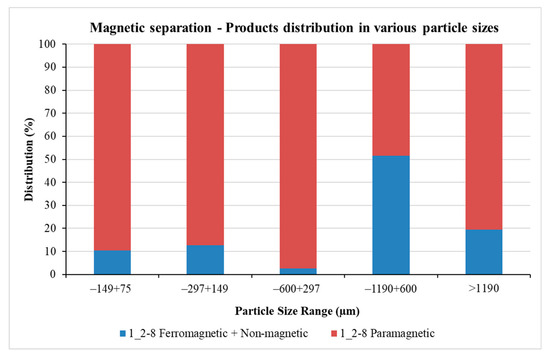 Assessing the particle sizes in the products in relation to what was in the feed, it was observed that 97 wt.% of the −600 to +297 µm particles, being the most abundant in these HT, were distributed to the paramagnetic fraction (Figure 15). This confirms that the minerals of interest, like scheelite, need to be further liberated from this particle size fraction in order to improve mineral separation by magnetic separation.