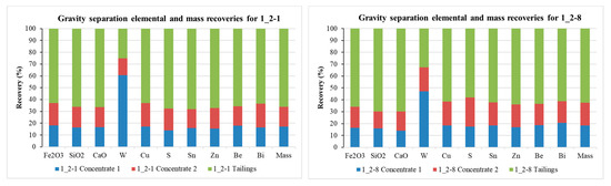 The two layers (1_2-1 and 1_2-8) of drill core 1_2 were individually used for gravity separation tests with the Knelson concentrator, with two separation cycles for each sample. For comparison in metallurgical performance, these samples were quite similar in terms of mass distribution in the core, but slightly different in chemical composition, grain size, and exposure to weathering. The recovery of scheelite in each cycle product was assessed by the amount of W (Figure 16). It was observed that recovery of W in the concentrates was decreasing with an increasing number of separation cycles, with the highest recovery being 60.6 wt.% in concentrate 1 of layer 1_2-1. The decrease in W recovery with increasing number of separation cycles was due to the decreasing amount of dense and coarse particles that contain W. In this regard, comparison between the two layers showed a higher W recovery in concentrate 1 for layer 1_2-1, which was coarser with higher W content than layer 1_2-8. This can be seen in the products mass balance calculations given in Table 6.