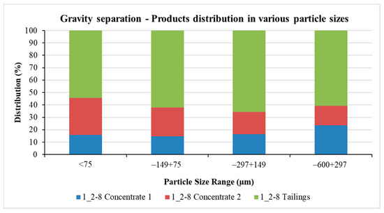 Using products distribution in various particle sizes to further assess the concentration process (Figure 17), it was confirmed that the dense coarser (–600 to +297 µm) particles were distributed more to concentrate 1 than 2, while the dense finer (<75 µm) particles were higher in concentrate 2 than 1. Therefore, in order to minimize W losses in the fines to the tailing fraction, the particle size range of the feed material to the Knelson concentrator must be narrow; otherwise, many concentration cycles would be needed to optimize the recovery. In this initial metallurgical test work, the feed particle size range was −600 to +38 µm; however, for subsequent tests, division of this size range into narrower ones such as −600 to +297 µm, −297 to +149 µm, −149 to +75 µm, and −75 to +38 µm should be considered in order to improve the recovery and separation efficiency [19].