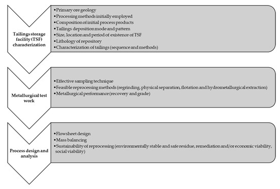 Based on the preliminary study presented in this paper and future work foresight, a methodology for reprocessing the Yxsjöberg HT is proposed (Figure 19). The methodology is divided into three main steps, namely, TSF characterization, metallurgical test work, and process design and analysis. Each of these steps has defined tasks, which represent sub-steps and methods to be undertaken in each step, e.g., characterization of tailings is a sub-step in the TSF characterization category, but it also has sub-steps and methods as shown in Figure 4. The methodology is preliminary because, with further investigations on the tailings, sub-steps that are more specific may be added to the three methodology steps.