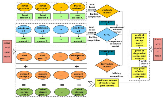The volatility of a new energy output leads to bidding bias when participating in the power market competition. A pumped storage power station is an ideal method of stabilizing new energy volatility. Therefore, wind power suppliers and pumped storage power stations first form wind storage joint ventures to participate in power market competition. At the same time, middlemen are introduced, constructing an upper-level game model (considering power producers and wind storage joint ventures) that forms equilibrium results of bidding competition in the wholesale and power distribution markets. Based on the equilibrium result of the upper-level model, a lower model is constructed to distribute the profits from wind storage joint ventures. The profits of each wind storage joint venture, wind power supplier, and pumped storage power station are obtained by the Nash negotiation and the Shapely value method. Finally, a case study is conducted. The results show that the wind storage joint ventures can improve the economics of the system. Further, the middlemen can smooth the rapid fluctuation of power price in the distribution and wholesale market, maintaining a smooth and efficient operation of the electricity market. These findings provide information for the design of an electricity market competition mechanism and the promotion of new energy power generation.