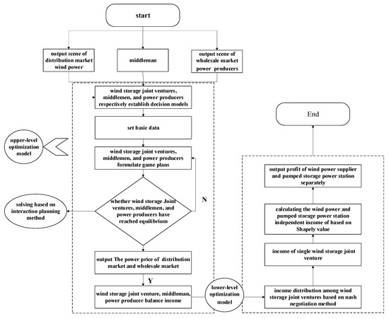 The remainder of this paper is organized as follows: In Section 2, we construct the upper-level game model of power producers and wind storage joint ventures, establish a market trading framework, propose model assumptions, and establish a decision-maker model for power producers, middlemen, and wind storage joint ventures. In Section 3, based on the wind storage joint venture profit to construct the lower-level distribution model, the Nash negotiation method is used to distribute the profit between the wind storage joint ventures. The Shapely value is used to distribute the profit between the wind power suppliers and the pumped storage power stations. In Section 4, the model calculation method and solution are processed. In Section 5, the correctness of the two-layer stochastic optimization model is verified by a case study, which provides a reference for distributed power generation to participate in the bidding competition of the power market. Section 6 highlights the main conclusions of the paper.