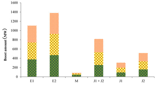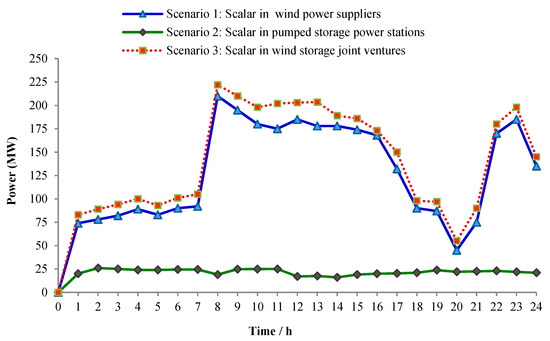 The boost amount of each subject in different scenarios is shown in Figure 3. The total number of bids for wind power suppliers and pumped storage power stations is the sum of the scalar quantities of wind power suppliers and pumped storage power stations. Pumped storage power stations can be bought and stored when the market power price is low, and sold when the market power price increases (to obtain profits).