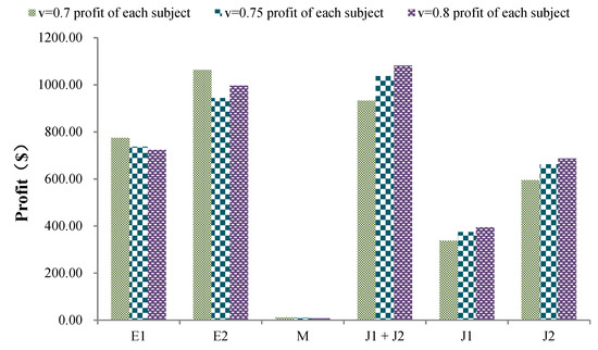 It can be seen from Figure 4 and Figure 5 that the operating efficiency of the pumped storage power station increases from 0.7 to 0.8, and the scalar quantity and profit of the wind storage joint venture will increase accordingly. The operation efficiency of the pumped storage power station will reduce the operating cost of the unit, improve the flexibility of adjustment, and enable the wind storage joint ventures to improve the decision parameters and boost amount in the market, ultimately increasing the profit of wind storage joint ventures. However, the increased supply of wind storage for the joint ventures will lead to a decline in the distribution market’s equilibrium electricity price. The decrease in the power price difference between the distribution market and the wholesale market will cause the middlemen to lower their decision-making behavior parameters. As a result, the denominator’s declared power is reduced, which makes the profit of the middlemen decrease with the increase of the pumped storage unit’s operating efficiency. The decrease of the middlemen’s boost amount in the market will cause the decline of the market’s demand and will cause the wholesale market’s power price and the power producers’ boost amount to decline. The simultaneous changes in income and cost leads to a large drop, then a slight rise.
