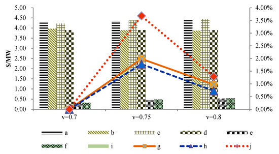 To study the mechanism in the distribution and wholesale markets, we established two scenarios (with and without middlemen) to analyze the impact of the equilibrium results. The changes of power prices in the two markets (with and without middlemen) are shown in Figure 6. Here, a, b, c, d, e, f, g, h, i, j represent the power price of the distribution market with middlemen; the power price of the wholesale market with middlemen; the power price of the distribution market without middlemen; the power price of the wholesale market without middlemen; two market power price difference with middlemen; two market power price difference without middlemen; power price fluctuations in the distribution market with middlemen; power price fluctuations in the wholesale market with middlemen; power price fluctuations in the distribution market without middlemen; and power price fluctuations in the wholesale market without middlemen, respectively.