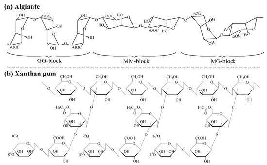 Parts of molecule structures of (a) alginate and (b) xanthan gum.
