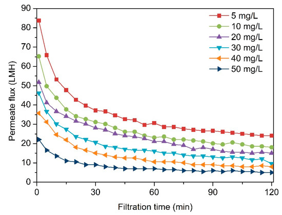 In order to examine the effect of alginate concentration on membrane fouling, a set of alginate sodium solutions at 5 mg/L, 10 mg/L, 20 mg/L, 30 mg/L, 40 mg/L, and 50 mg/L were prepared. Before we conduced filtration tests, each membrane filter was contracted for three hours to exclude the interference of membrane and to achieve a stable stage of the membrane. This contraction could provide a relatively stable permeate flux and yield an accurate result. As shown in Figure 2, the filtration behaviors of these alginate samples were evaluated with a filtration time of 2 h. From the result in Figure 2, it demonstrated that with increasing of the alginate sodium concentration, the declines of the permeate flux became more serious. The reason for the slowdown in the permeate flux was possibly due to the fact that the pores of the membrane were blocked by alginate chains, thus the amount of water that can pass through membrane reduced. The more foulant, the more serious fouling was observed. From Figure 2, for the first 15 min, we can see that there was a drastic decrease of flux in the dead-end filtration system. However, from 60 min onwards, the flux started to be more constant. The fouling extent was determined by the filtration performance of the first 15 min. These results suggested that the fouling development in the filtration process was profoundly influenced by the initial stage of filtration. This set of experiment was run for 2 h. It shows that by 60 min, most of the pores on the membrane were relatively blocked and there was no drastic decline of flux anymore. It had come to a plateau by 120 min. Similarly, research done by Susanto et al., suggests that there is a possibility that a small amount of alginate could have entered the pores of the membrane causing the flux to decline drastically especially for 50 mg/L alginate sodium [34]. The flux went to the steady state at a much earlier time compared to the other concentrations of alginate feed solutions.