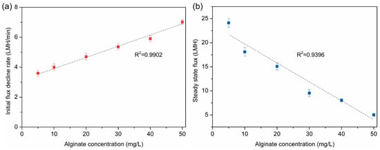 (a) The relationship between initial flux decline rate and alginate concentration and (b) the relationship between the steady state flux and alginate concentration.