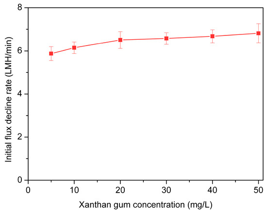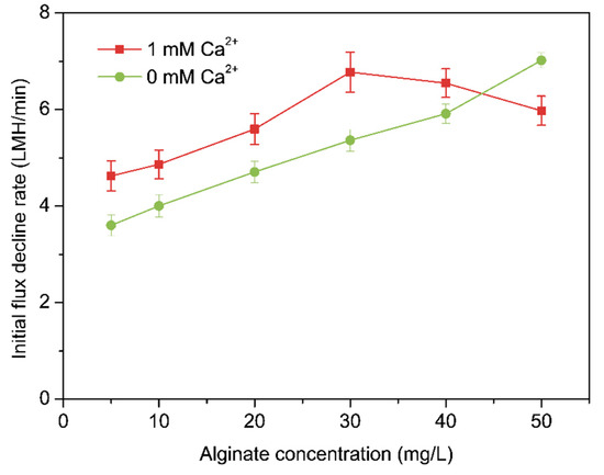 The effect of calcium ions on the fouling of xanthan gum was not obvious, as seen in the filtration of alginate. As shown in Figure 10, the initial flux decline rates of xanthan gum mixed with 1 mM Ca2+ were relatively stable. Not like the alginate feed solutions, no big difference was observed among different concentrations of xanthan gum samples. More importantly, the effect of Ca2+ on xanthan gum did not show a unimodal mode. As discussed above, the xanthan gum had much higher molecular weights than alginate. Additionally, the molecule of alginate was a linear chain while xanthan gum molecule had branches. It turned out the interaction between Ca2+ and xanthan gum was much weaker [42]. Therefore, the influence of Ca2+ on the xanthan gum fouling was not obvious as that observed in the filtration of alginate.