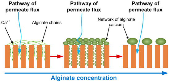 Schematic description of the pathways of permeate flux with increasing the alginate concentrations.